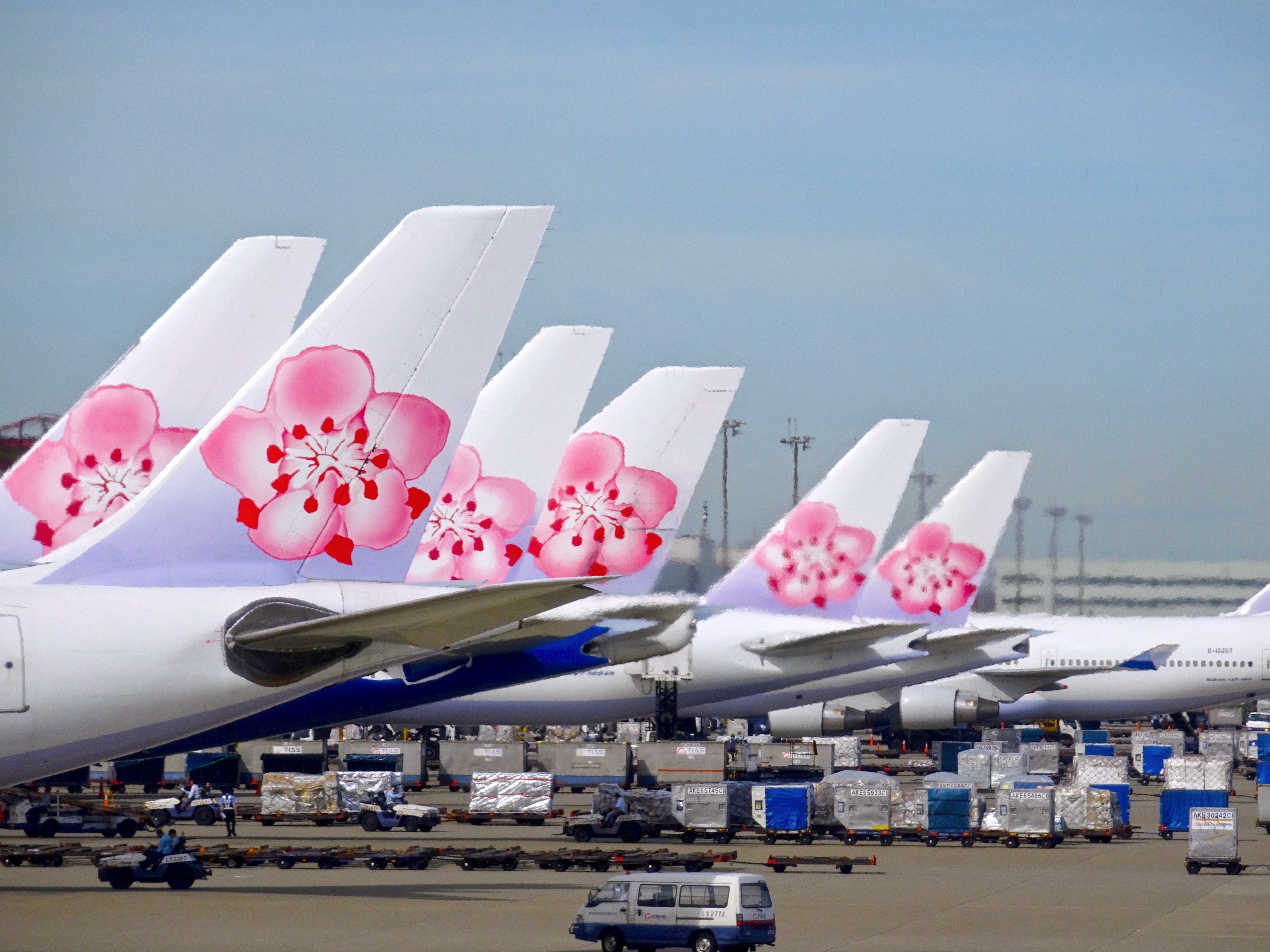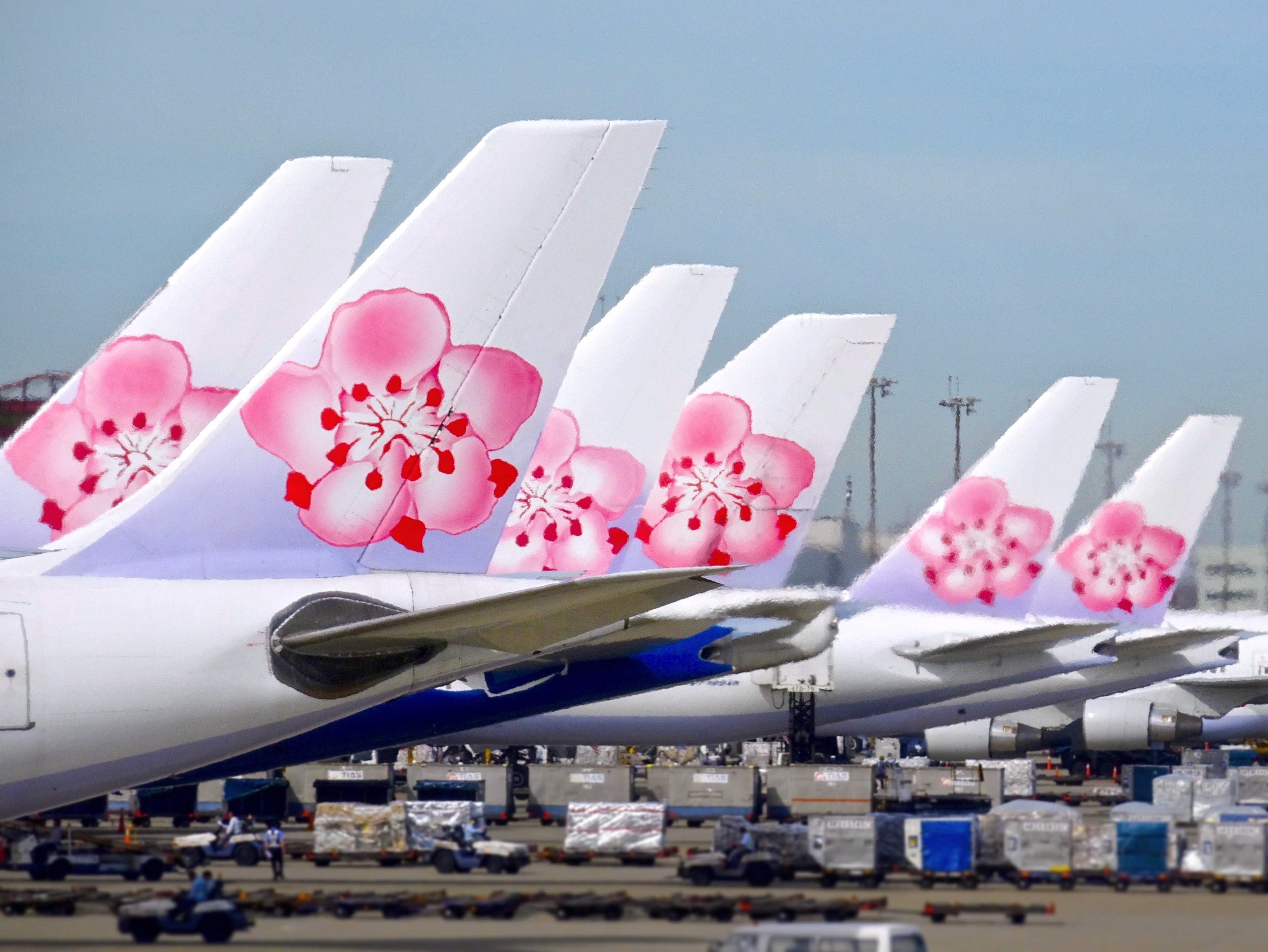 Đội hình phản lực của China Airlines, gồm những chiếc Airbus A330-300, Boeing 747-400 và Boeing 777-300ER, tại Sân bay quốc tế Đào Viên Đài Loan.
