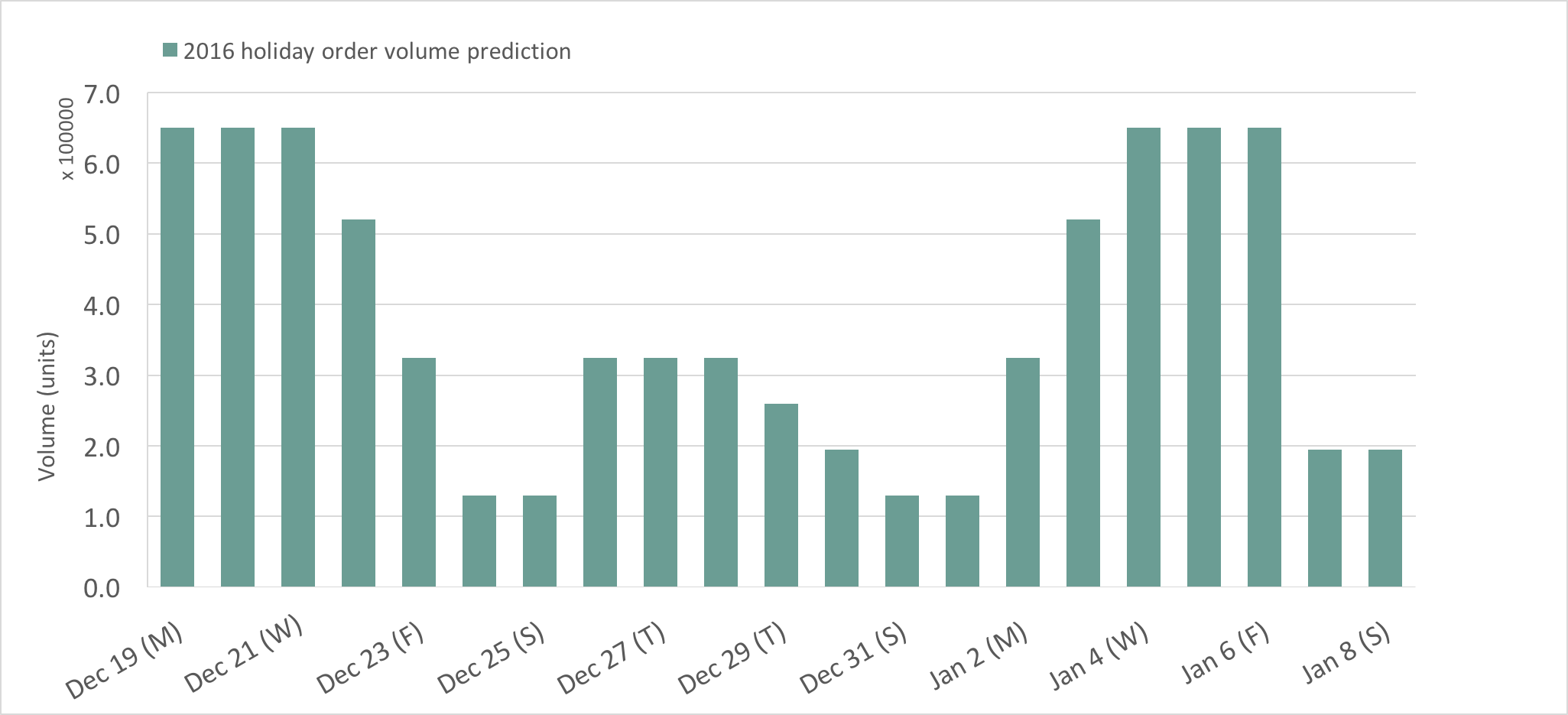 Actual 2016 holiday order volume followed our forecasts fairly closely, as shown in Chart 2 below. Due to our conservative approach, the forecasted volumes were mostly higher than actual volumes (the only under-forecasted day, Dec 24, was due to one, large unexpected order). This over-forecasting was particularly evident after Jan 1, where actual volume was lower than expected. Still, predictions up until Jan 1 achieved an accuracy of 71%.