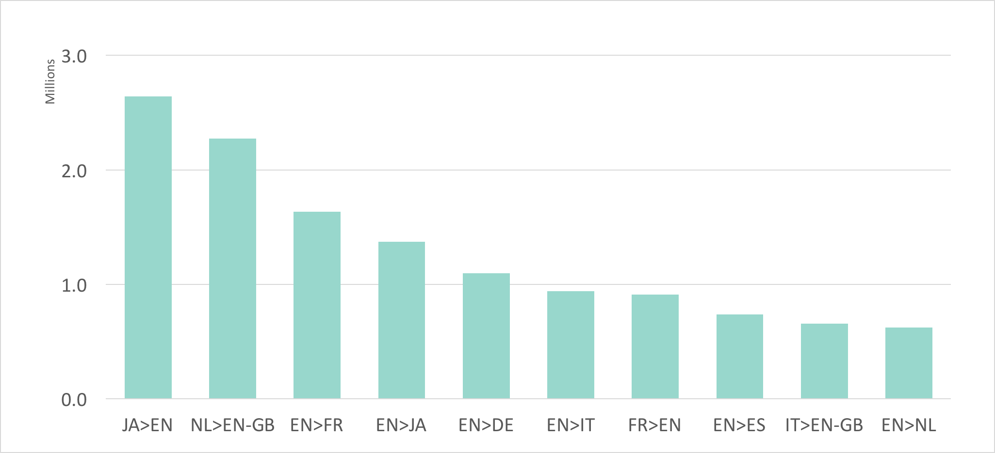 All languages from the top 10 list are the same as the month prior. 2.6M characters were translated in Japanese to English last month, an increase from January. Dutch to British English, English to French and English to Japanese also had strong months, translating 2.3M, 1.6M and 1.4M words, respectively.
