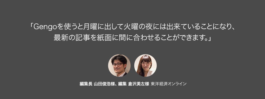 1895年創立から既に100年を超える歴史を持ちながら、現代の政治経済を鋭く、時に分かり易く解説する気鋭のメディアとして近年、インターネットにも果敢に挑戦している東洋経済新報社。今回は、Gengoの日英、英日の翻訳サービスをどのように活用しているのか、デジタルメディア局、東洋経済オンラインの編集長 山田俊浩様と編集 倉沢美左様にお話をお伺いしました。