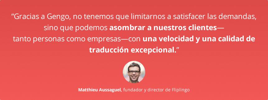 La plataforma fácil de usar de Gengo demostró constituir la solución perfecta para Fliplingo. Con una documentación y unas bibliotecas de clientes amplias, la integración de la API de Gengo resultó tan sencilla como copiar y pegar. Para ofrecer asistencia adicional, en el caso en el que los desarrolladores de Fliplingo encontraran algún problema, el equipo de integraciones especializado de Gengo prestaba su ayuda.