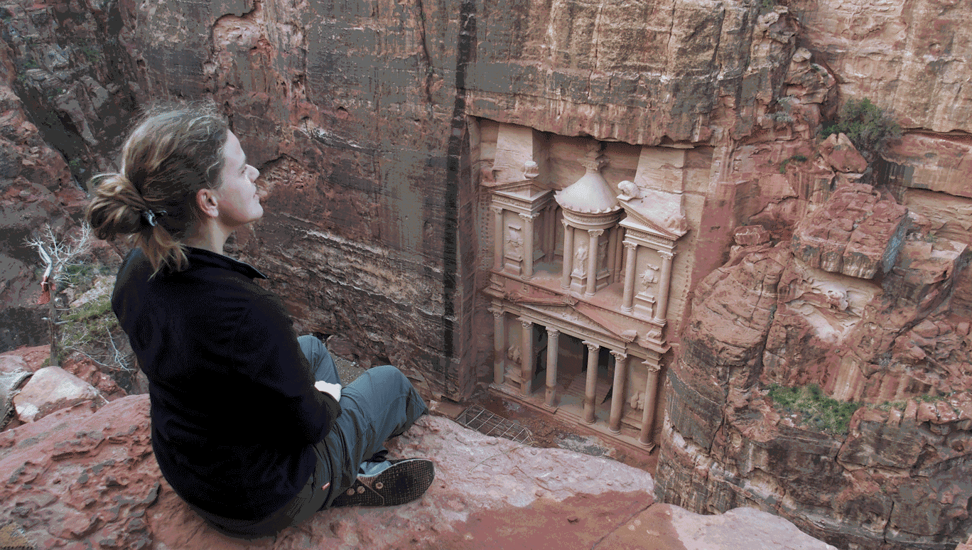 “After climbing to find a view of the Treasury Tomb in Petra, Jordan, at sunrise on Christmas Day.”