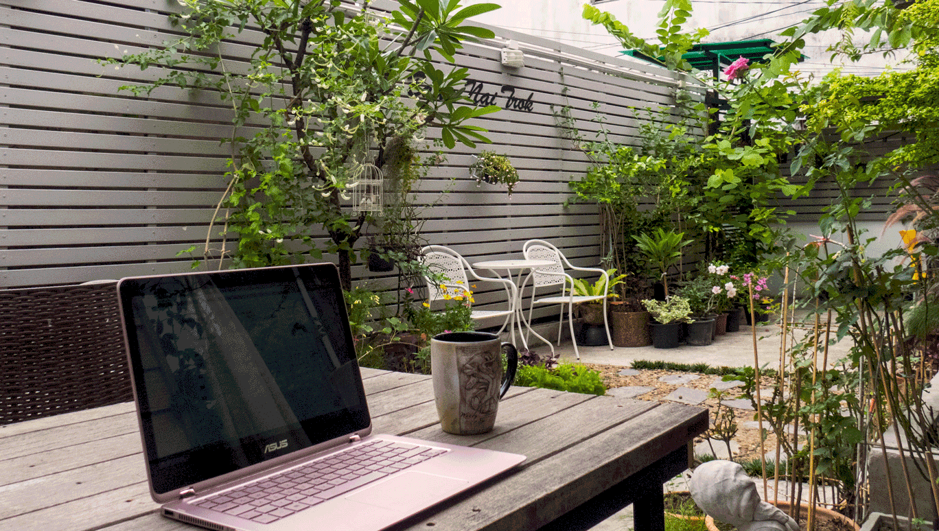 “My workspace in a lovely little guesthouse with a garden in Bangkok, Thailand.”