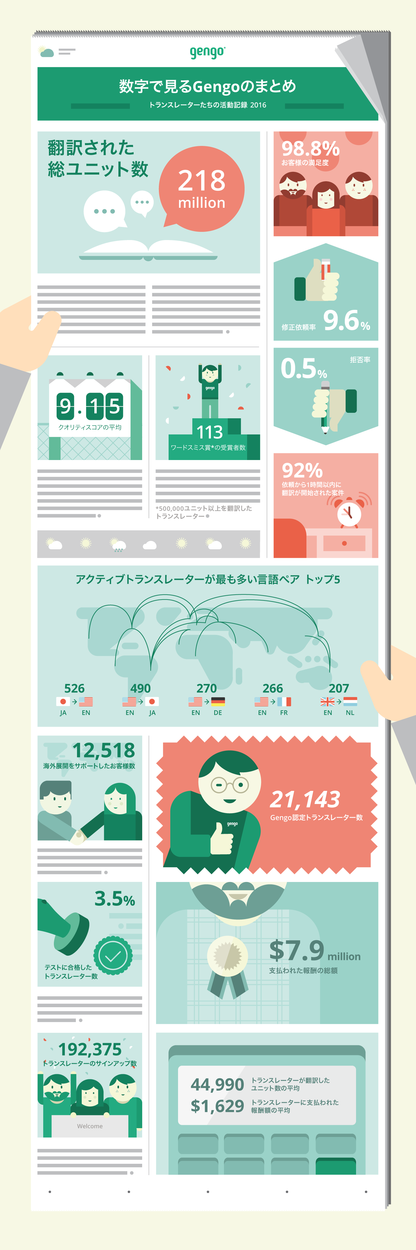 2016年は著しい成長を遂げ、大きなマイルストーンを達成した1年となりました。Gengoの成長をより分かりやすく紹介するために、2016年のデータをインフォグラフィックにまとめました。2017年もトランスレーターの皆さんと共に、翻訳で世界中のコミュニケーションを円滑にし、お客様のグローバリゼーションのお役に立つことができれば幸いです。