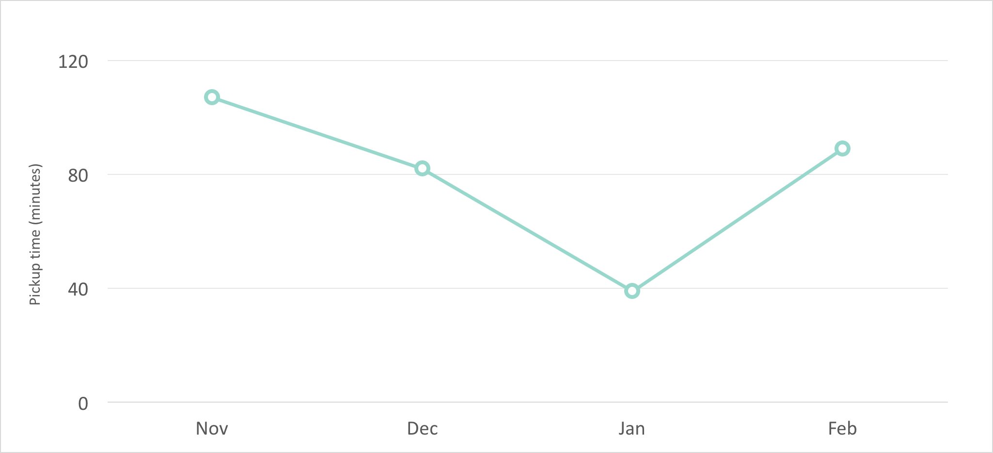 ピックアップタイムは3ヵ月に渡って向上していましたが、2月は89分とスピードがわずかに落ちてしまいました。これは、95%の案件がお客様の依頼後89分以内にピックアップされたことを示します。比較対象として、1月のピックアップ時間は39分でした。スピードはGengoのお客様にとって重要な要素の一つですので、引き続きこのメトリックを慎重にモニタリングして行きたいと思います。